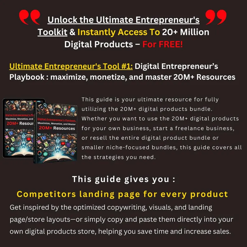 โ ๐๐จ๐ง๐ฎ๐ฌ #๐ : ๐๐ข๐ ๐ข๐ญ๐๐ฅ ๐๐ง๐ญ๐ซ๐๐ฉ๐ซ๐๐ง๐๐ฎ๐ซ๐ฌ ๐๐ฅ๐๐ฒ๐๐จ๐จ๐ค: This guide is your ultimate resource for fully utilizing the 20M+ digital products bundle. Whether you want to use the 20M+ digital products for your own business, start a freelance business, or resell the entire digital product bundle or smaller niche-focused bundles, this guide covers all the strategies you need. Get inspired by the optimized copywriting, visuals, and landing page/store layoutsโor simply copy and paste them directly into your own digital products store, helping you save time and increase sales.