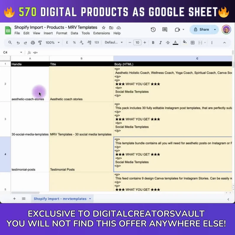 570 Digital Products Google Sheet CSV + Shopify Import files – Commercial Use – Plus Master resell rights MRR + PLR for the Products