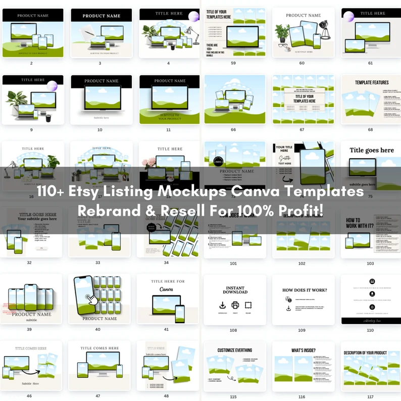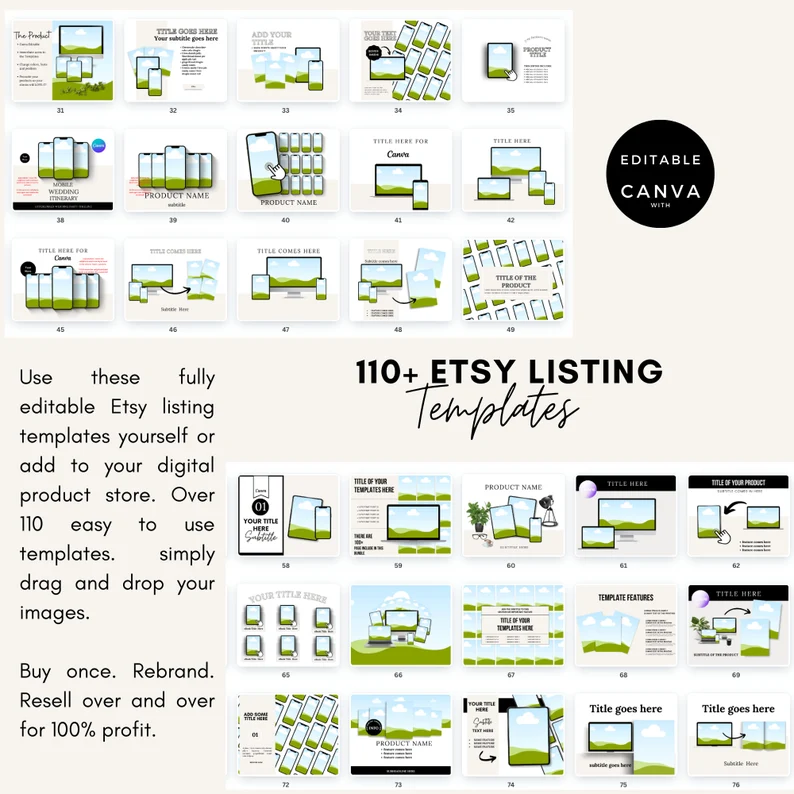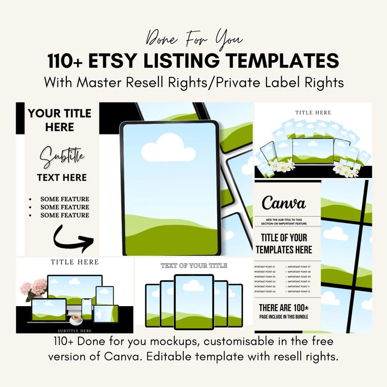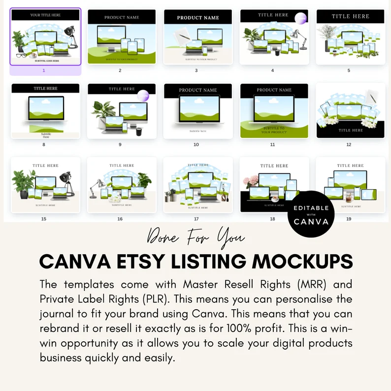 The Etsy mockup templates with PLR & MRR are perfect to use yourself or to add add to your online store. They are also fully editable in the free version of Canva. You can change the colours, fonts and design to match your brand.